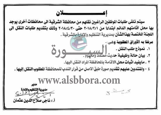 كشفت مديرية التنظيم والادارة بمحافظة الشرقية أن أخر موعد لتلقى طلبات الراغبين فى النقل من المحافظة الى أى محافظة 30 إبريل 2018، وأرفقت فى الاعلان الأوراق المطلوبة.