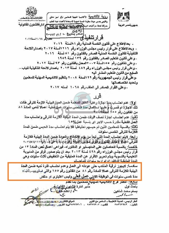 أفاد الناشط التعلميى، الحسين محمد منصور الجعفرى، بأنه لا يجوز ترقية المنتدب حتى عودته الى العمل وعدم احتساب فترة ندبه ضمن المدة البينية اللازمة للترقى اعمالا للمادة رقم 81 من القانون رقم 155 لسنة 2007 والتى استوجبت قضاء مدة خمس سنوات فى الوظيفة الأدنى عمل فعلى وليس اعتبارى.