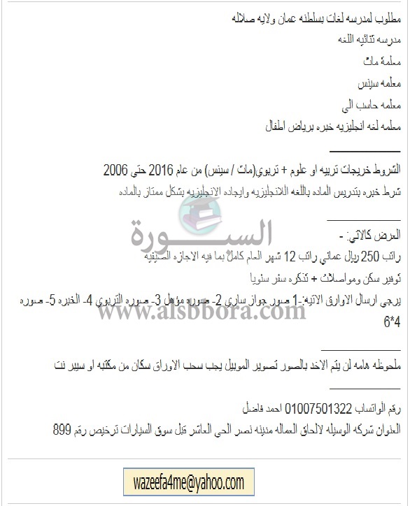 تعلن مدرسة خاصة في سلطنة عمان عن وظائف جديدة للمعلمين والمعلمات وذلك وفقا لنص الإعلان التالي:-