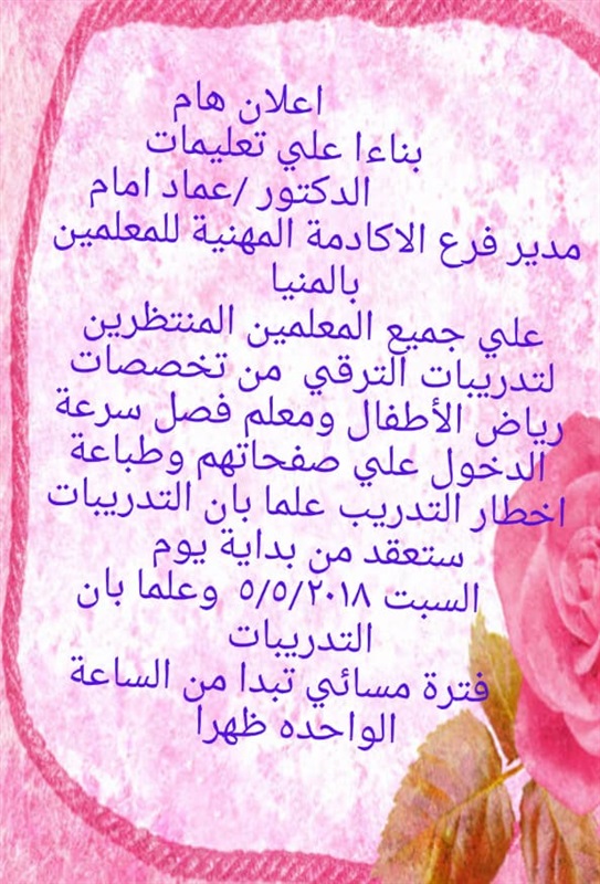 تعقد تدريات المعلمين من أجل الترقى على المعلمين تخصصات رياض الاطفال ومعلم فصل سرعة الدخول على صفحاتهم وطباعة الاخطار لمعرفة موعد ومكان التدريب، علما بان التدريبات مسائي تبدأ من الساعة الواحدة ظهرا يوم السبت الموافق 5 مايو المقبل 2018.