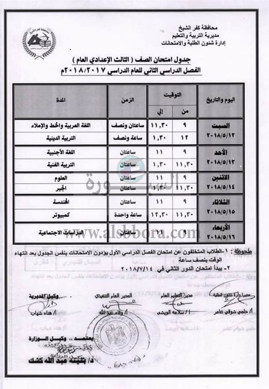 وأوضحت بأن إمتحانات الشهادة الإعدادية ستقام يوم الثالث عشر من مايو وتنتهى في السادس عشر من الشهر نفسه.