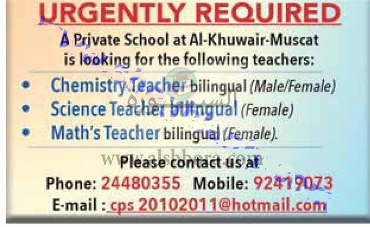 تعلن كبرى المدارس بسلطنة عمان عن حاجتها الى معلمين، وعلى الراغبين فى التقدم ارسال السيرة الذاتية عبر الايميل المنشور فى الاعلان التالى: