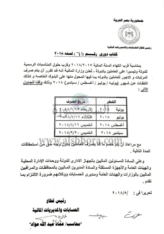 اصدرت وزارة المالية، قرار بتعديل مواعيد صروف مرتبات وأجور العاملين بالدولة بما فيها المحول منها على البنوك الخاصة وكذلك النفقات عن شهور "يونيو، يوليو، أغسطس، سبتمبر" لعام 2018، وذلك وفقا للجدول الآتى:
