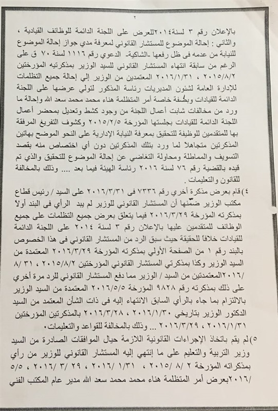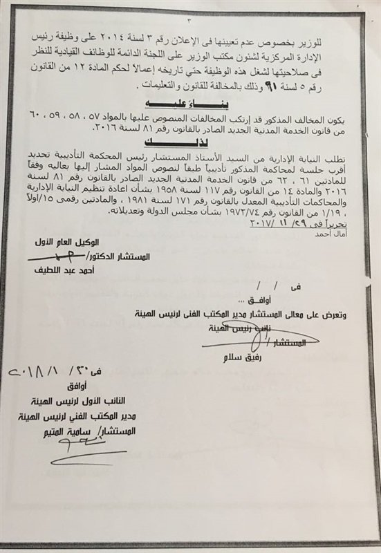 وافقت المستشار سامية المتيم، النائب الأول لرئيس الهيئة، على إحالة مدير عام الإدارة العامة لشئون المديريات والديوان العام بوزارة التربية والتعليم للمحاكمة العاجلة، بعد ثبوت مخالفته للقانون وخروجه عن مقتضى الواجب الوظيفي وعدم أدائه العمل المنوط به بدقة وأمانة.