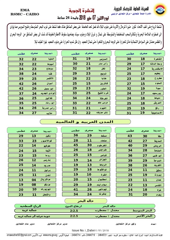 وأوضح خبراء الأرصاد أن الطقس معتدل على السواحل الشمالية مائل للحرارة على الوجه البحري والقاهرة حتى شمال الصعيد، وإن ظل شديد الحرارة على جنوب الصعيد نهارا، ودرجة الحرارة المتوقعة بالقاهرة غدا العظمى 30 والصغرى 18.