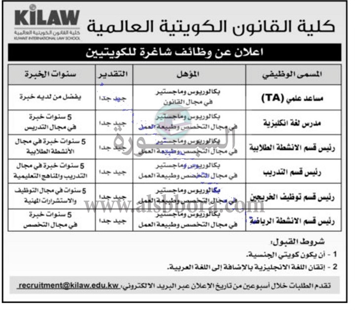 تعلن كلية القانون الكويتية عن حاجتها الى أعضاء هيئة التدريس من الجنسية الكويتية فقط وعلى الراغبين فى التقدم ارسال السيرة الذاتية عبر الايميل المنشور فى الاعلان التالى: