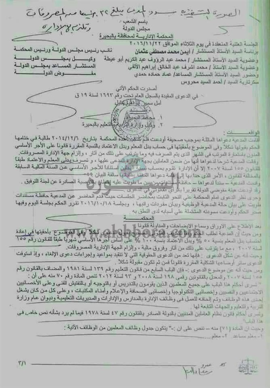 أحقية المعلم صرف بدل المعلم بنسبة 50% وبدل اعتماد بنسبة 100% على اساس الأجر الشهرى الحالى أول يوليو 2017، وليس على اساسى 30 يوينو 2015، وجاء حكم المحكمة كالتالى: