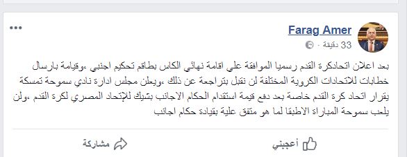 وقال فرج عامر عبر صفحته الشخصية على موقع التواصل الاجتماعى على "فيس بوك"، رداً على القرار:"أسرار وكواليس كثيرة سوف نعلن عنها فيما يخص نهائى الكأس".