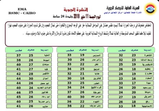 وكشف فاروق، عن درجات الحرارة المتوقعة يوم السبت المقبل، لتكون فى السواحل الشمالية بين 24 و 25، و الوجه البحرى والقاهرة 30، وشمال الصعيد 30، و جنوب الصعيد 36 درجة.