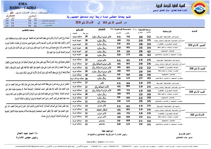 وقال مدير مركز التحاليل بالهيئة العامة للأرصاد الجوية، إنه مع يوم الأحد المقبل، سيسود طقسا معتدلا على السواحل الشمالية والوجه البحرى والقاهرة مائل للحرارة على شمال الصعيد حار على الجنوب نهارا لطيف ليلا، موضحا أن درجات الحرارة فى القاهرة الأحد المقبل متوقع أن تصل العظمى 29 درجة والصغرى 18 درجة.