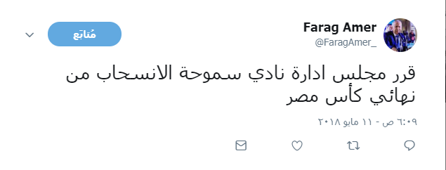 أعلن فرج عامر رئيس نادى سموحة انسحابه من مباراة نهائى كأس مصر امام الزمالك المقرر اقامتها يوم الثلاثاء المقبل على ملعب ستاد الجيش المصرى ببرج العرب.