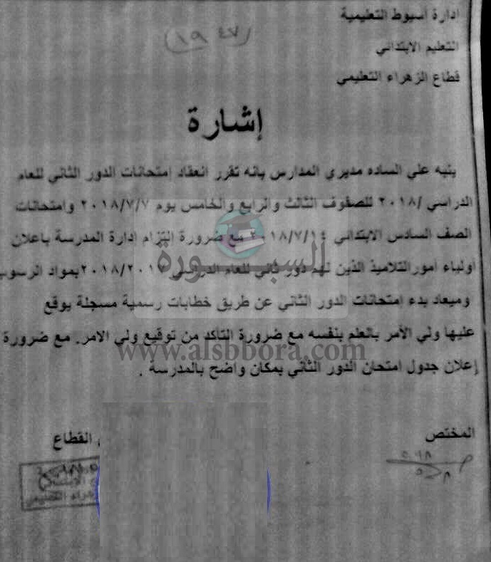 أعلنت مديرية التربية والتعليم بمحافظة اسيوط عن موعد امتحانات الدور الثانى لصفوف الثالث والرابع والخامس الابتدائى وذلك يوم 7 يوليو المقبل، وامتحانات الصف السادس يوم 14 يوليو، مع اتباع عدد من التعليمات الهامة الى جميع مديرى المدارس والتى جاءت فى الاشارة التالية: