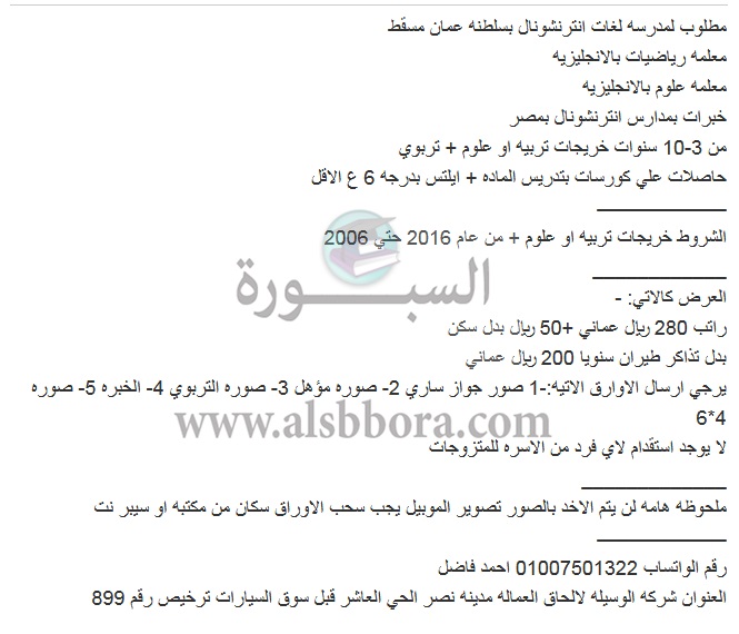 تعلن مدارس مسقط العمانية عن حاجتها للتعاقد مع معلمين ومعلمات جدد وذلك وفقا لنص الإعلان التالي:-