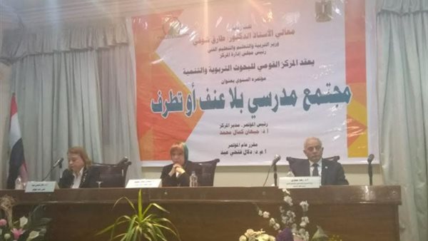 صرح الإعلامى أحمد خيرى المتحدث الرسمى باسم وزارة التربية والتعليم والتعليم الفنى، بأنه فى إطار توجيهات الدكتور طارق شوقى وزير التربية والتعليم والتعليم الفنى بعمل توعية وتثقيف وتصحيح للمفاهيم الخاطئة وذلك لمناهضة أفكار العنف والتطرف داخل المجتمع المدرسى، ومن هذا المنطلق عقد المركز القومى للبحوث التربوية والتنمية، مؤتمره السنوى برئاسة الدكتورة جيهان كمال رئيس المؤتمر ومدير المركز، تحت عنوان (مجتمع مدرسى بلا عنف أو تطرف)، بدار الضيافة بجامعة عين شمس بحضور الدكتور رضا حجازى رئيس قطاع التعليم العام، ولفيف من عمداء وأساتذة الجامعات المصرية، والخبراء التربويين، وقيادات وزارة التربية والتعليم والتعليم الفني، وأعضاء الهيئات البحثية بالمراكز البحثية.