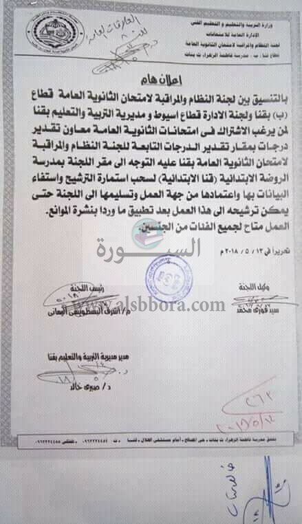أعلنت الادارة العامة لامتحانات الثانوية العامة التابعة لوزارة التربية والتعليم والتعليم الفنى، للراغبين من المعلمين فى الاشتراك فى امتحانات الثانوية العامة "معاون تقدي درجات بمقار تقدير الدرجات التابعة للجنة النظام والمراقبة لامتحان الثانوية العامة بقنا عليه التوجه الى مقر اللحنة بمدرسة الروضة الابتدائية (قنا الابتدائية) لسحب استمارة الترشيج واستفاء البيانات بها واعتمادها من جهة العمل وتسليمها الى اللجنة حتى يمكن ترشيحه الى هذا العمل بعد تطبيق ما وردا بنشرة الموانع العمل متاح لجميع الفئات من الجنسين.