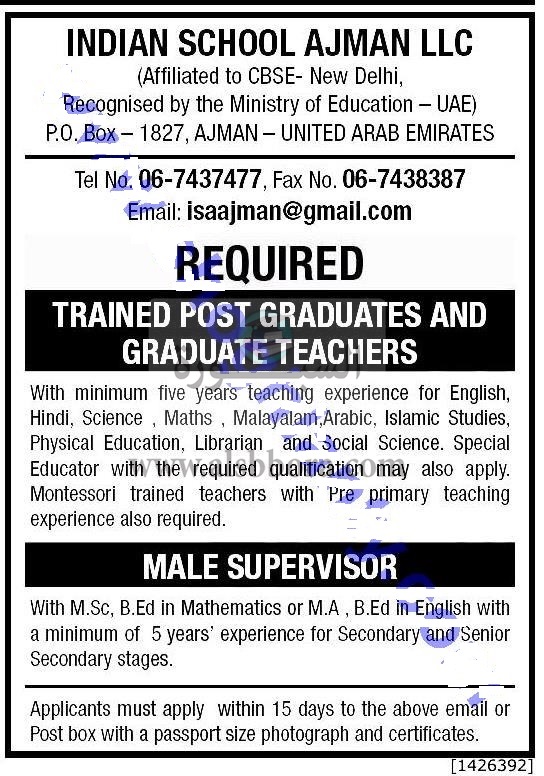 تعلن المدرسة الهندية بعجمان بدولة الامارات العربية المتحدة عن حاجتها الى معلمين، وعلى الراغبين فى التقدم ارسال السيرة الذاتية عبر الايميل المنشور فى الاعلان التالى: