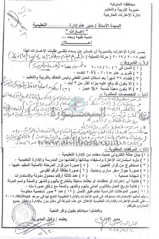 التعليم تعلن الشروط الواجب توافرها للمعلمين المتقدمين للاعارات الخارجية والأوراق المطلوبة 2019/2018