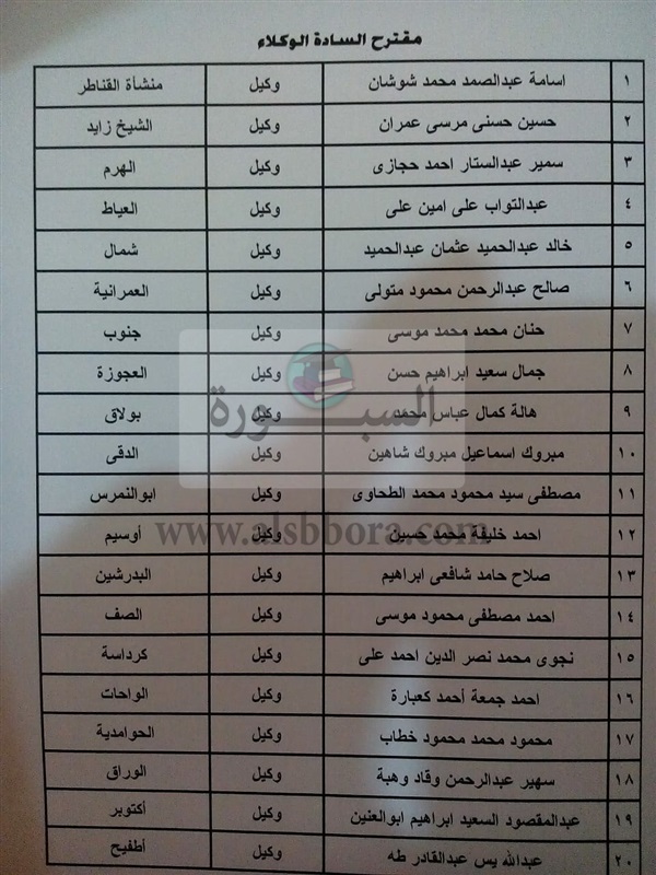 وحصلت"السبورة" على قائمة بالأسماء الكاملة للقيادات الجديدة على مستوى المحافظة.