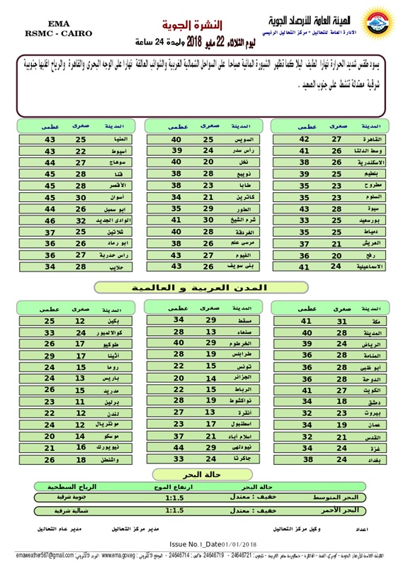 حذر خبراء هيئة الأرصاد الجوية من طقس اليوم الثلاثاء حيث من المتوقع ان يسود طقس شديد الحرارة نهارا لطيف ليلا، كما تظهر الشبورة المائية صباحا على السواحل الشمالية الغربية والشوائب العالقة نهارا على الوجه البحرى والقاهرة والرياح أغلبها جنوبية شرقية معتدلة تنشط على جنوب الصعيد.