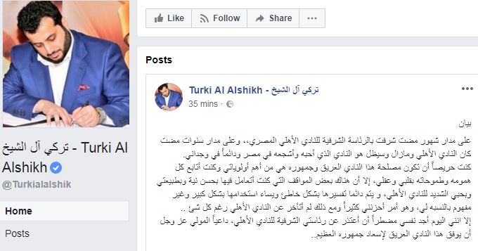 اعلن المستشار تركى آل الشيخ، اعتذاره عن رئاسة النادى الأهلى الشرفية فلا بيان رسمى له كتبه على صفحته الرسمية على موقع التواصل الاجتماعى تويتر وجاء البيان كالأتى: