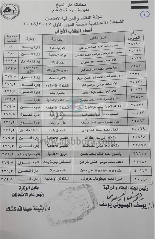 ننشر أسماء أوائل الشهادة الإعدادية فى كفرالشيخ