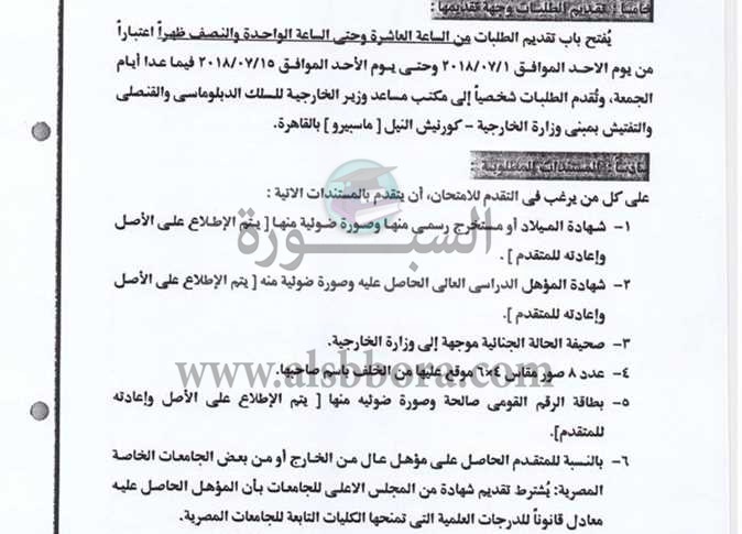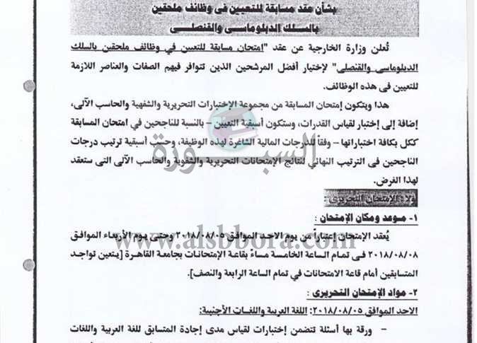 نشرت الصفحة الرسمية لوزارة الخارجية، بموقع التواصل الاجتماعي، فيسبوك، إعلان رقم (1) لسنة 2018 بشأن عقد مسابقة للتعين في وظائف ملحقين بالسلك الدبلوماسي والقنصلي.