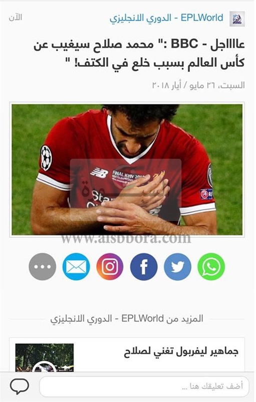 عاااااجل ..bbc : محمد صلاح سيغيب عن كأس العالم بسبب خلع فى الكتف