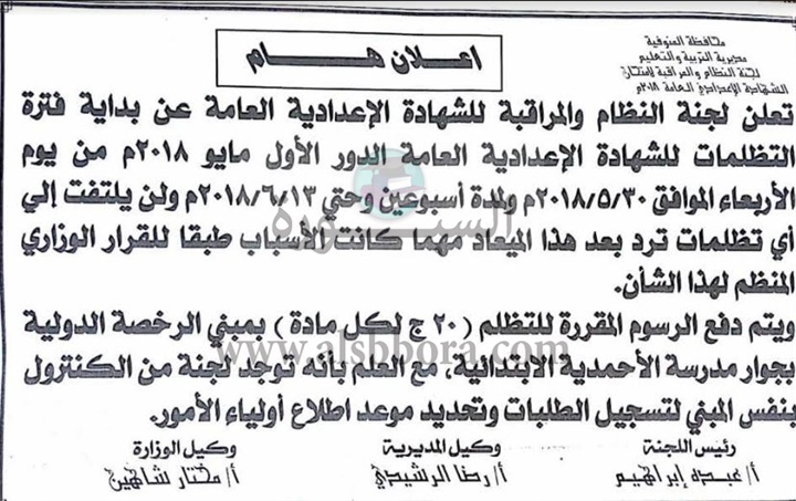 بدء تظلمات الشهادة الإعدادية الدور الأول 2018 بالمنوفية