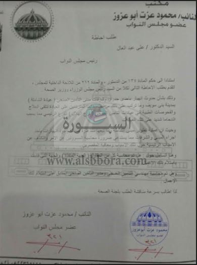 وطالب العضو البرلمانى من رئيس مجلس النواب ضرورة سرعة مناقشة طلب الإحاطة بأسرع وقت بلجنة الصحة .