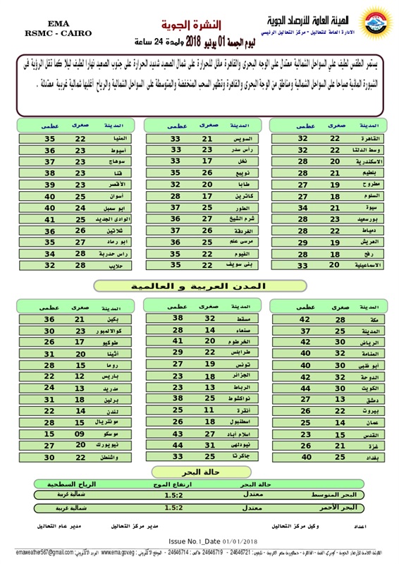 اعلن خبراء هيئة الأرصاد الجوية انه من المتوقع أن يسود اليوم الجمعة طقس لطيف على السواحل الشمالية، معتدل على الوجه البحري والقاهرة، مائل للحرارة على شمال الصعيد، شديد الحرارة على جنوب الصعيد نهارا لطيف ليلا.