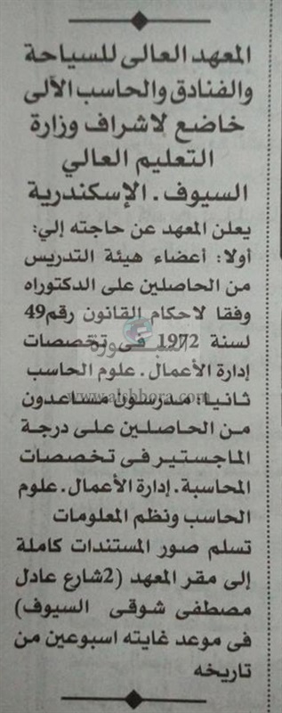 يعلن المعهد العالى للسياحة والفنادق والحاسب الآلى الخاضع لاشراف وزارة التعليم العالى والبحث العلمى بالاسكندرية عن حاجته الى اعضاء هيئة التدريس، وعلى الراغبين فى التقدم تسليم صور المستندات فى مقر المعهد على العنوان المنشور فى اعلان جريدة الأهرام اليوم الجمعة الموافق أول يونيو 2018.