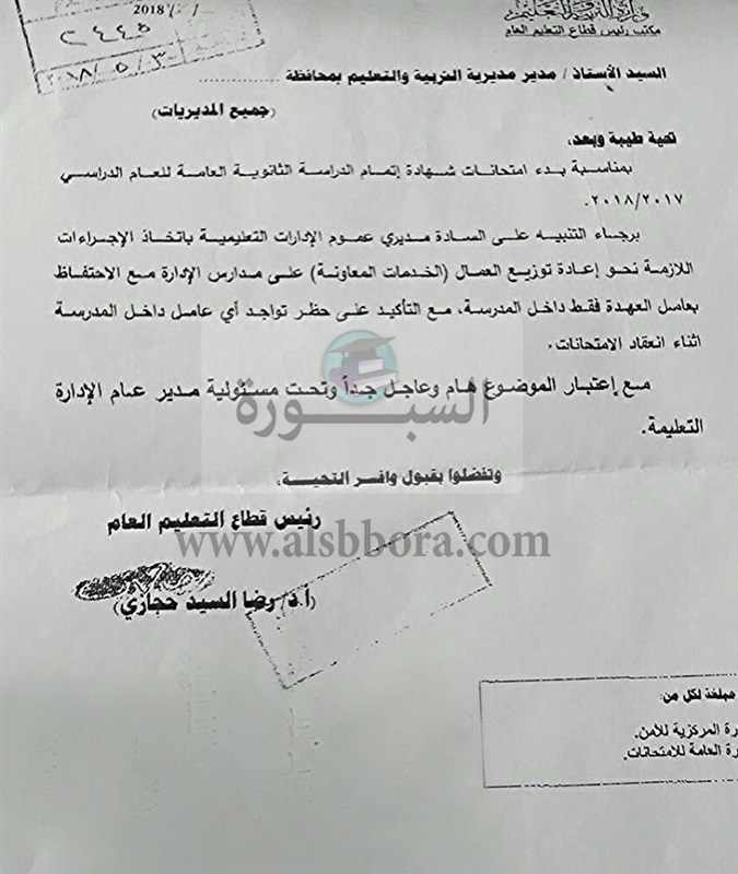 أصدرت وزارة التربية والتعليم امر اداريا الى جميع المديريات والادارات التعليمية بشأن اخلاء جميع العاملين من المدارس وتوزيعها على المدارس التى يعقد بها لجان امتحانات الثانوية العامة للعام الدراسى 2018/2017، ما عدا عامل العهدة فقط.