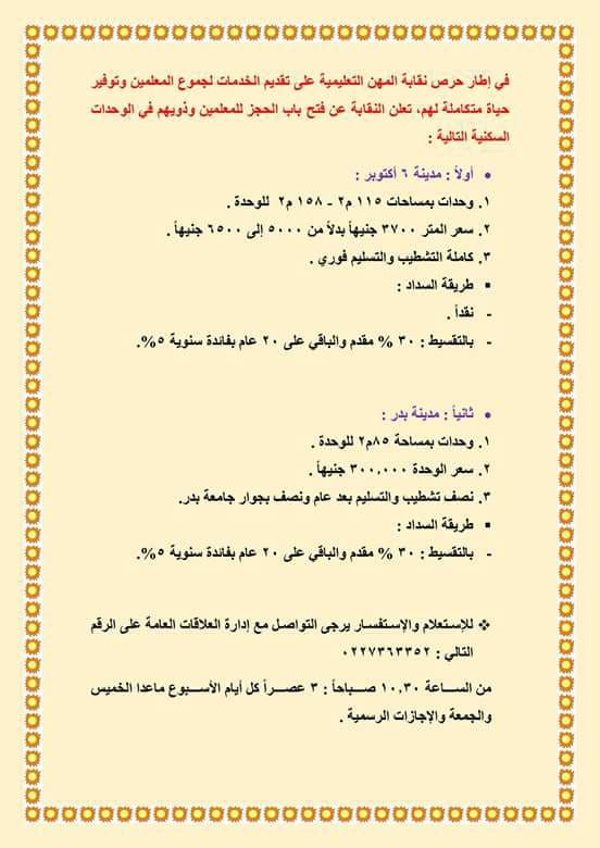 اعلنت النقابه المهنية للمعلمين عن تقديم خدمات للمعلمين بفتح باب الحجز بعدد من الوحدات السكنية ببعض المدن الجديدة وفقا للاعلان الرسمى الصادر عن النقابه فى المدن التالية