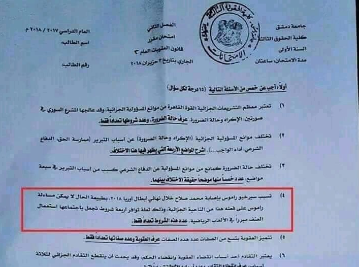 فوجئ طلاب السنة الاولى بسؤال بمادة قانون العقوبات بكلية الحقوق بجامعة دمشق يخص إصابة محمد صلاح، نجم نادى ليفربول الإنجليزى والمنتخب الوطنى لكرة القدم، على يد سيرجيو راموس، لاعب نادي ريال مدريد، في المباراة التى جمعت بين النادى الملكى وليفربول فى نهائى دورى أبطال أوروبا.
