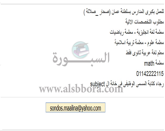 تعلن مدارس صلالة العمانية عن وظائف جديدة للمعلمين والمعلمات في جميع المواد وذلك وفقا لنص الإعلان التاليي:-