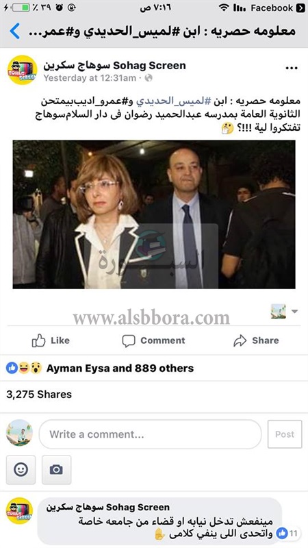 تناقل رواد مواقع التواصل الاجتماعى خلال الساعات الماضية خبرا باداء " نور " نجل لميس الحديدى وعمرو اديب امتحانات الثانوية العامة بلجنة عبدالحميد رضوان بدار السلام بمحافظة سوهاج من اشهر لجان الغش خلال السنوات الماضية على مستوى الجمهورية والتى اتخذت وزارة التربية والتعليم اجراءات رادعة ضدها بعد قيام اصحاب النفوس الضعيفة بتحويل ابنائهم اليها خلال العام الدراسى الحالى ، مؤكدين ان المعلومة صحيحة 100%