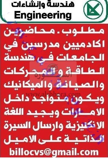 تعلن كبرى الجامعات بدولة الامارات العربية المتحدة عن حاجتها الى محاضرين ومدرسين واعضاء هيئة التدريس وعلى الراغبين فى التقدم ارسال السيرة الذاتية عبر الايميل المنشور فى الاعلان التالى: