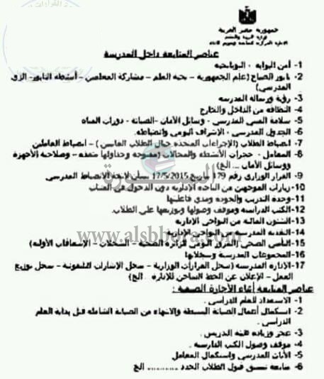 ينشر موقع السبورة منشورا مهما الى جميع المعلمين على مستوى الجمهورية بشأن عناصر المتابعة داخل المدرسة واثناء الاجازة الصيفية والتى جاء كما يلى: