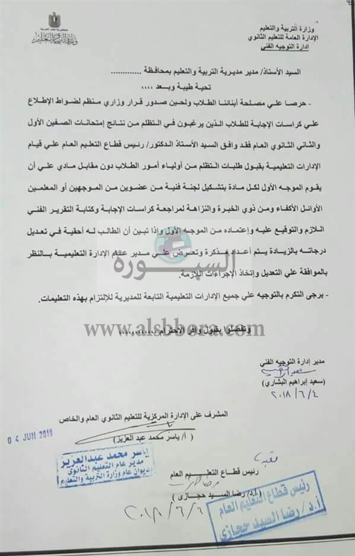 اصدرت الادارة العامة للتعليم الثانوى بوزارة التربية والتعليم والتعليم الفنى، قرارا بقبول طلبات التظلم من قبل الطلاب وأولياء الأمور على نتيجة الصف الأول والثانى الثانوى والاطلاع على كراسات الاجابة مجانا دون دفع اى مبالغ مالية لحين صدور قرار وزارى ينظم هذه العملية.