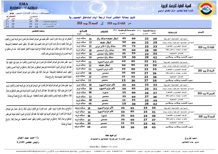 وتوقع خبراء هيئة الأرصاد الجوية، أن يسود طقس معتدل على السواحل الشرقية مائل للحرارة على السواحل الغربية حار على الوجه البحرى والقاهرة وشديد الحرارة على جنوب الصعيد.