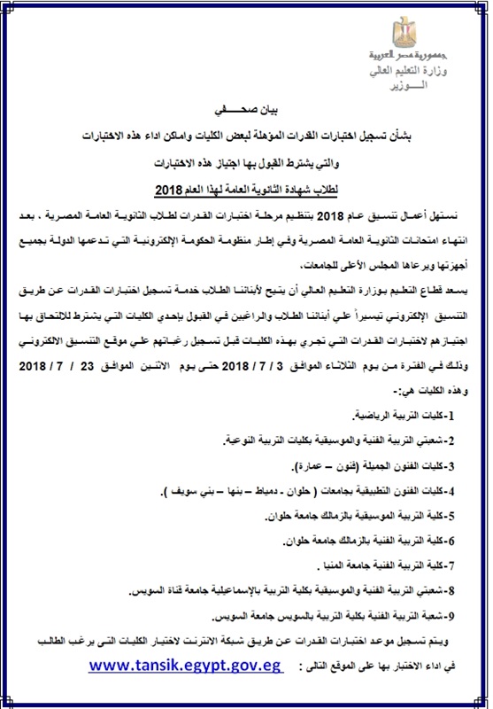 كشفت وزارة التعليم العالى والبحث العلمى عن أماكن ومواعيد اختبارات القدرات لطلاب الثانوية العامة للعام الدراسى 2018/2017، وذلك في الفترة من يوم الثلاثاء الموافق 2018/7/3حتى يوم الإثنين الموافق 2018/7/23
