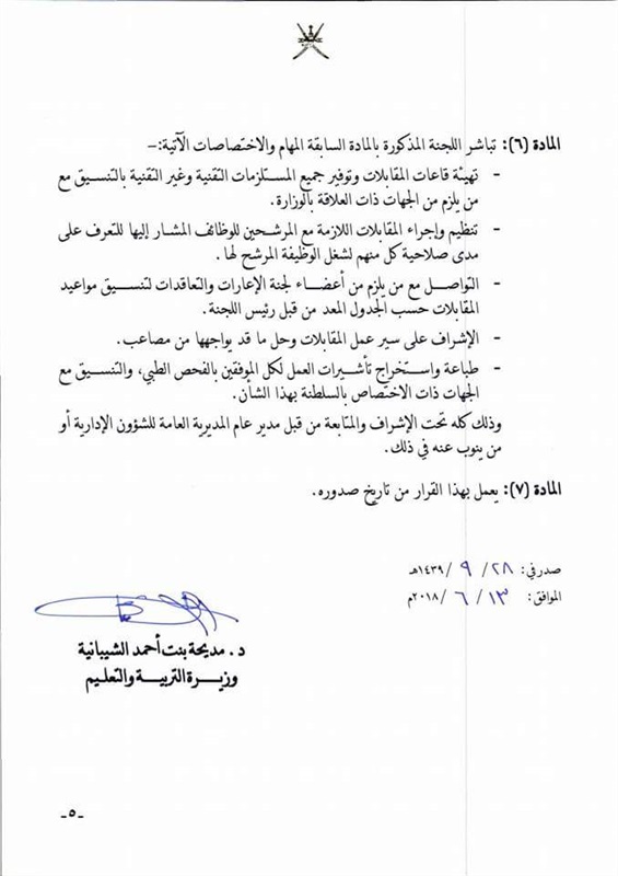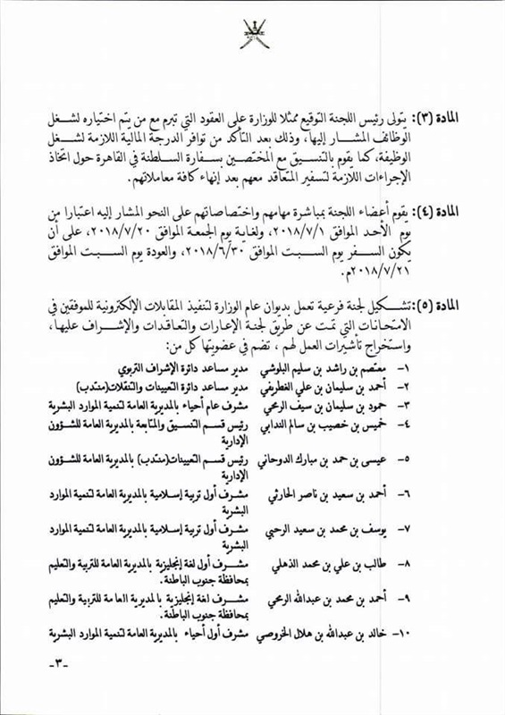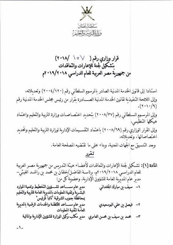 اعلنت دوله عمان عن بدء اجراء المقابلات للساده المعلمين المتقدمين للاعارات للعام 2018 / 2019 للعمل بسلطنه عمان للتخصصات الوارده بالاعلان ، حيث تم تشكيل اللجنه برئاسة خلفان بن محمد ﺑﻦ ﺭﺍﺷﺪ ﺍﻟﻐﻴﺜﻲ _ ﺍﻟﻤﺪﻳﺮ ﺍﻟﻌﺎﻡ ﻟﻠﺸؤﻭﻥ ﺍﻹﺩﺍﺭﻳﺔ ﺑديوان ﻋﺎﻡ ﺍﻟوﺯﺍﺭﺓ ورئيس لجنة الاعارات و التعاقدات لجمهورية مصر العربية للعام الدراسي 2019-2018 وتبدأ اللجنه مباشره عملها بدايه يوليو 2018