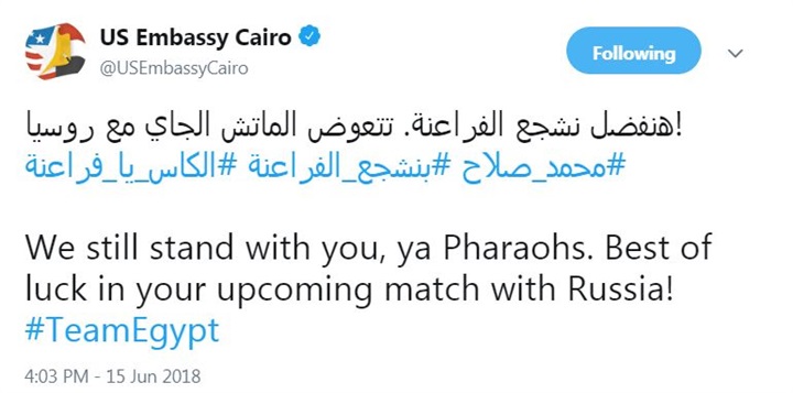 وكتب الحساب الرسمى للسفارة، عبر موقع التدوينات القصيرة "تويتر" :" هنفضل نشجع الفراعنة. تتعوض الماتش الجاى مع روسيا! #الكاس_يا_فراعنة #بنشجع_الفراعنة #محمد_صلاح".