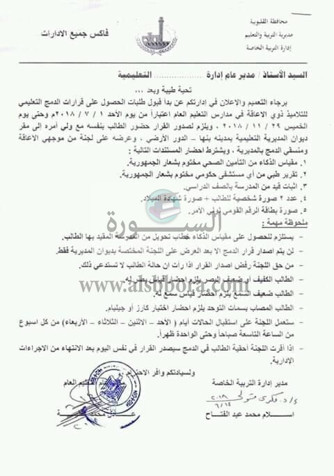 ارسلت مديرية التربية والتعليم بمحافظة القليوبية فاكسا مهما الى جميع الادارات التعليمية بشأن بدء قبول طلاب الدمج للمدارس بداية من اول يوليو المقبل الى يوم الخميس 29 نوفمبر 2018.