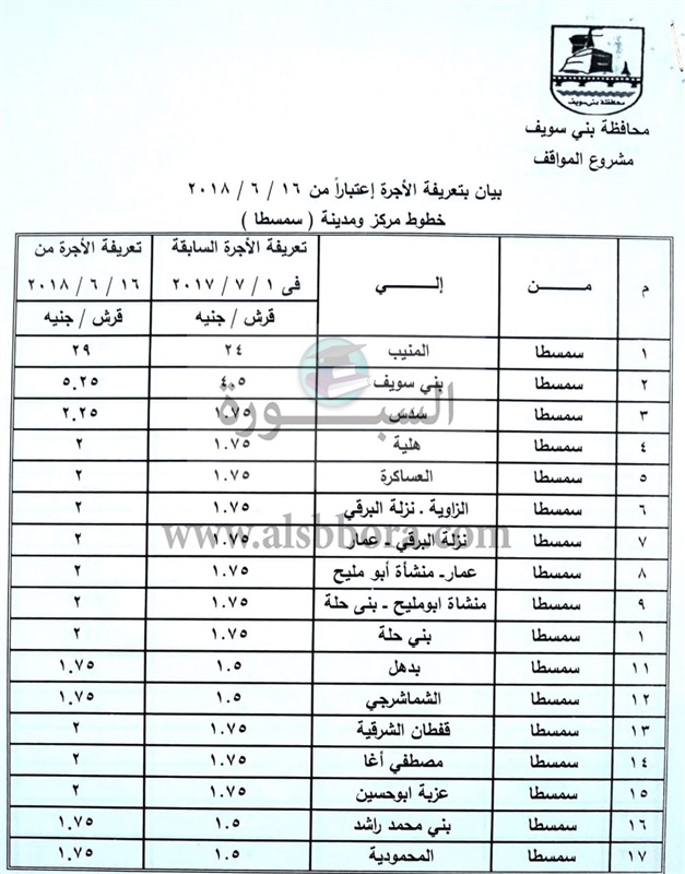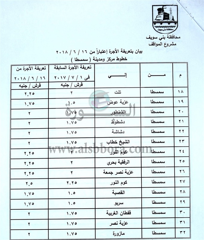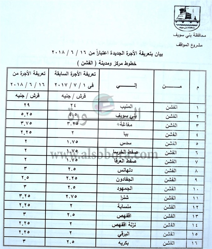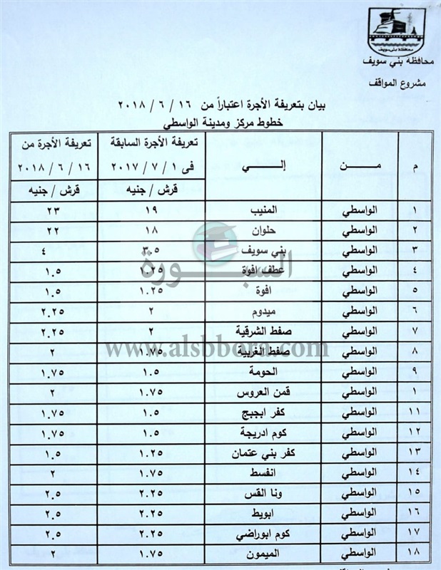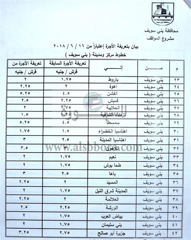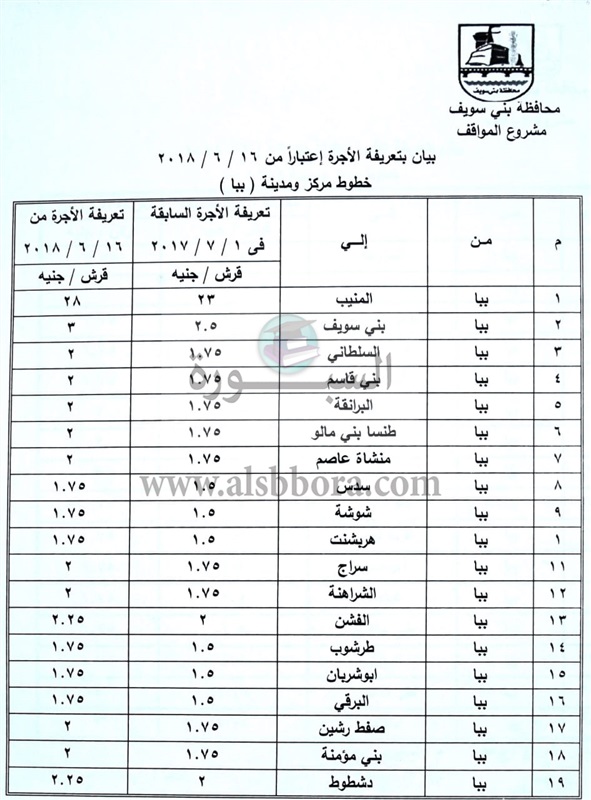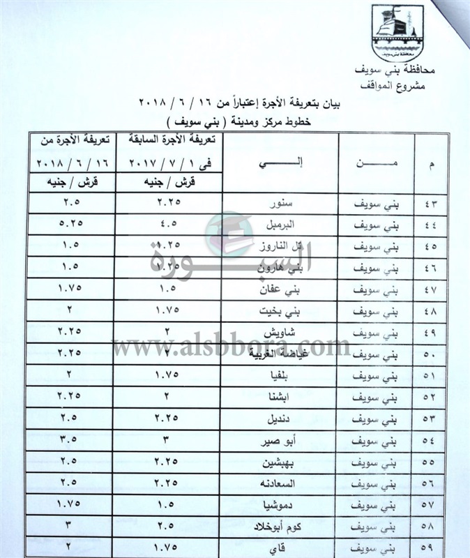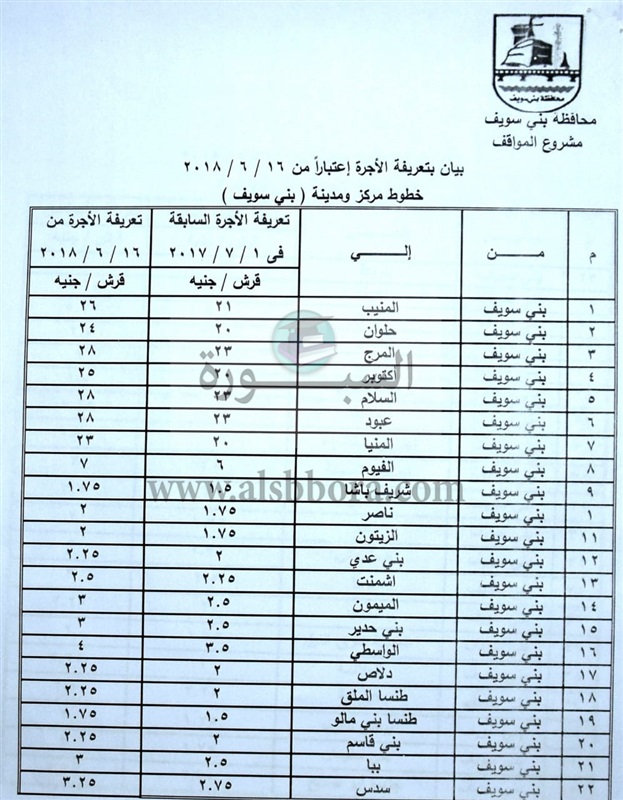 وقد حددت التعريفة الجديدة أجرة سيارات السرفيس داخل مدينة بني سويف بـ 150 قرشاً ، و7 جنيه للتاكسي داخل المدينة ، و14 جنيه للتاكسي بين المدينة وشرق النيل ، وبالنسبة لتعريفة الركوب بين مدينة بني سويف والمراكز فقد تم تحديدها بـ 4 جنيه لخط بني سويف/ الواسطى ، و2 جنيه لخط بني سويف / ناصر، و 5.25 جنيه لخط بني سويف /الفشن ، و3 جنيه لخط بني سويف /اهناسيا ، 5.25 جنيه خط بني سويف / سمسطا ، و3 جنيه لخط بني سويف /ببا