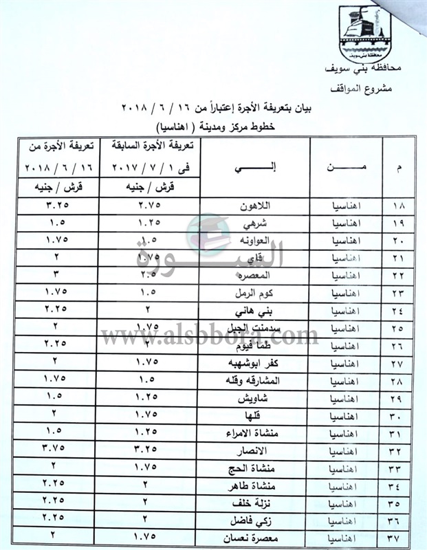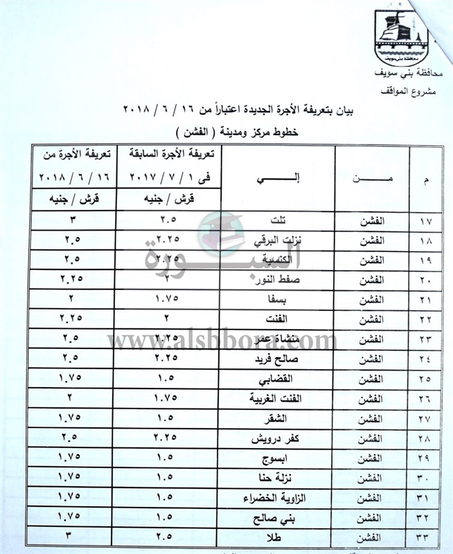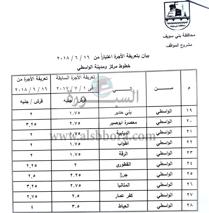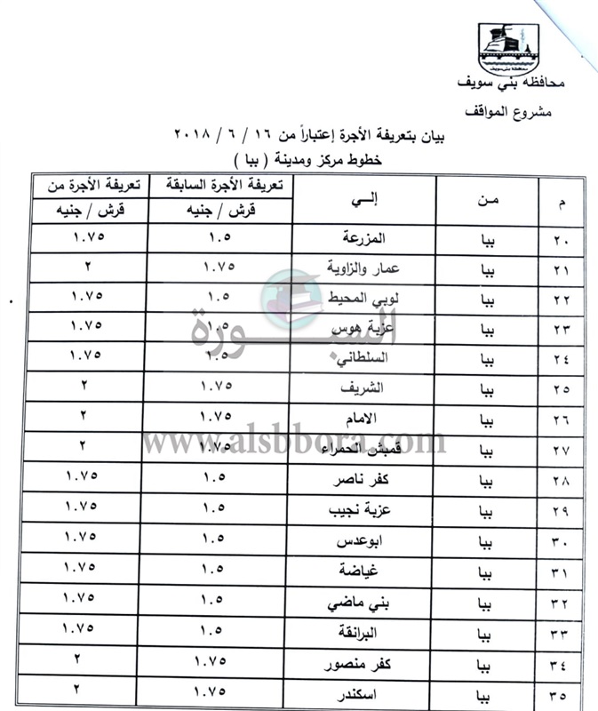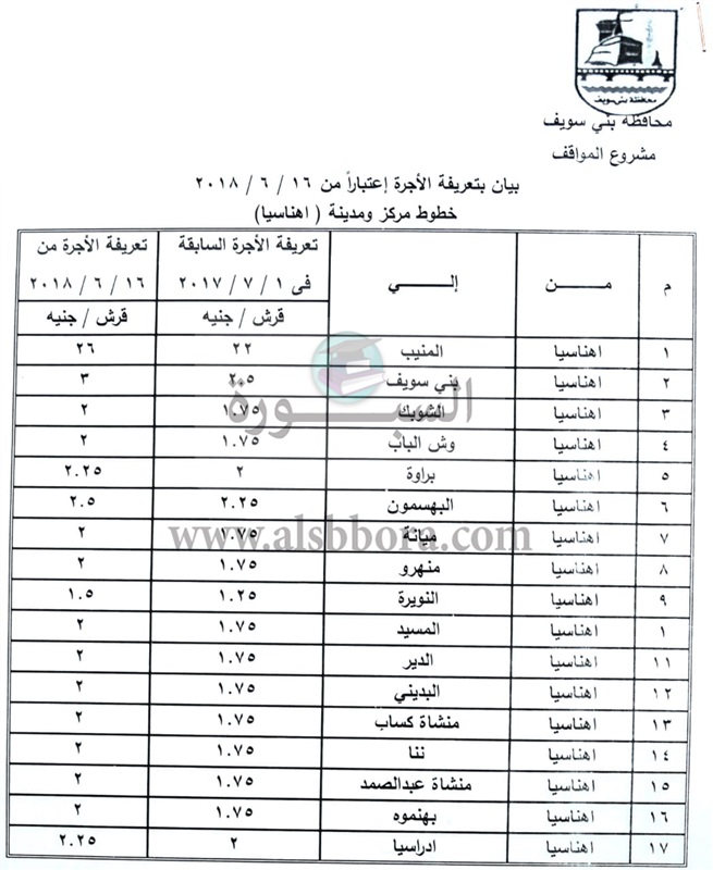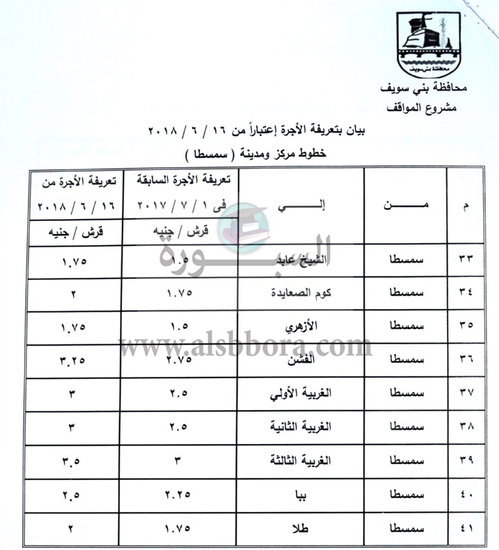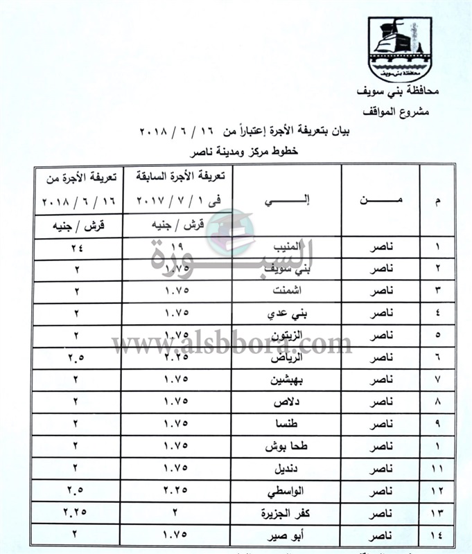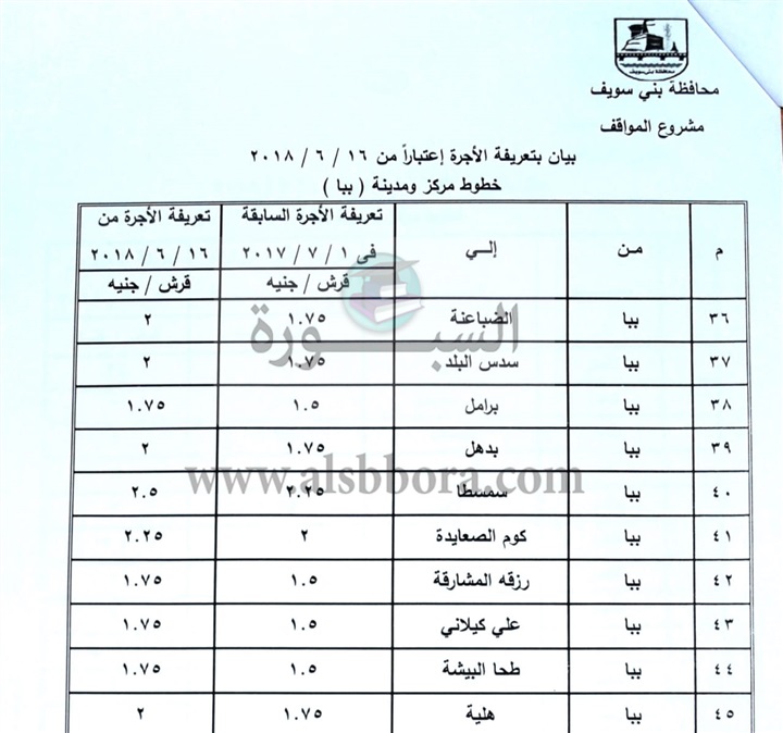 وقد حددت التعريفة الجديدة أجرة سيارات السرفيس داخل مدينة بني سويف بـ 150 قرشاً ، و7 جنيه للتاكسي داخل المدينة ، و14 جنيه للتاكسي بين المدينة وشرق النيل ، وبالنسبة لتعريفة الركوب بين مدينة بني سويف والمراكز فقد تم تحديدها بـ 4 جنيه لخط بني سويف/ الواسطى ، و2 جنيه لخط بني سويف / ناصر، و 5.25 جنيه لخط بني سويف /الفشن ، و3 جنيه لخط بني سويف /اهناسيا ، 5.25 جنيه خط بني سويف / سمسطا ، و3 جنيه لخط بني سويف /ببا