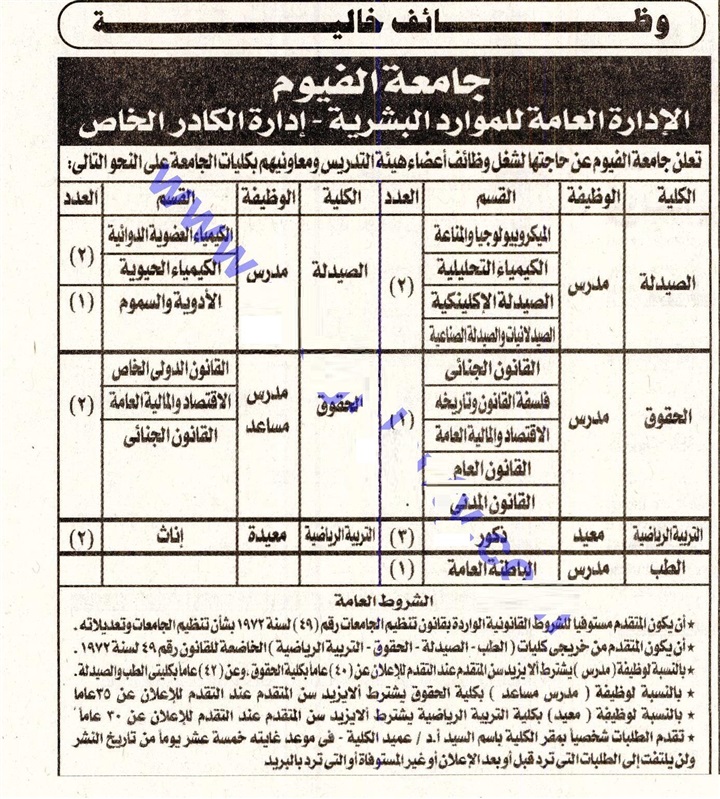 تعلن جامعة الفيوم عن وظائف جديدة لأعضاء هيئة التدريس"من معيد إلي أستاذ" في عدد من كلياتها وذلك وفقا لنص الإعلان التالي:-