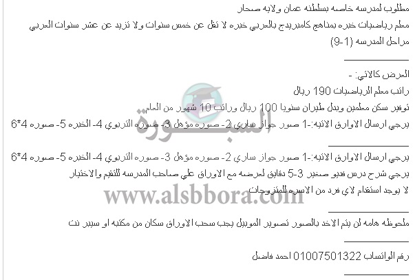 تعلن مدرسة خاصة في سلطنة عمان عن وظائف جديدة للمعلمين والمعلمات وذلك وفقا لنص الإعلان التالي:-
