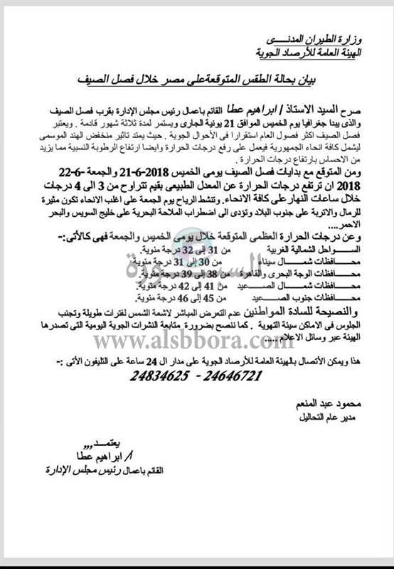 أصدرت هيئة الأرصاد الجوية بيانا هاما بشأن بداية فصل الصيف اليوم وتوجه نصائح للمواطنين وإليكم نص البيان :