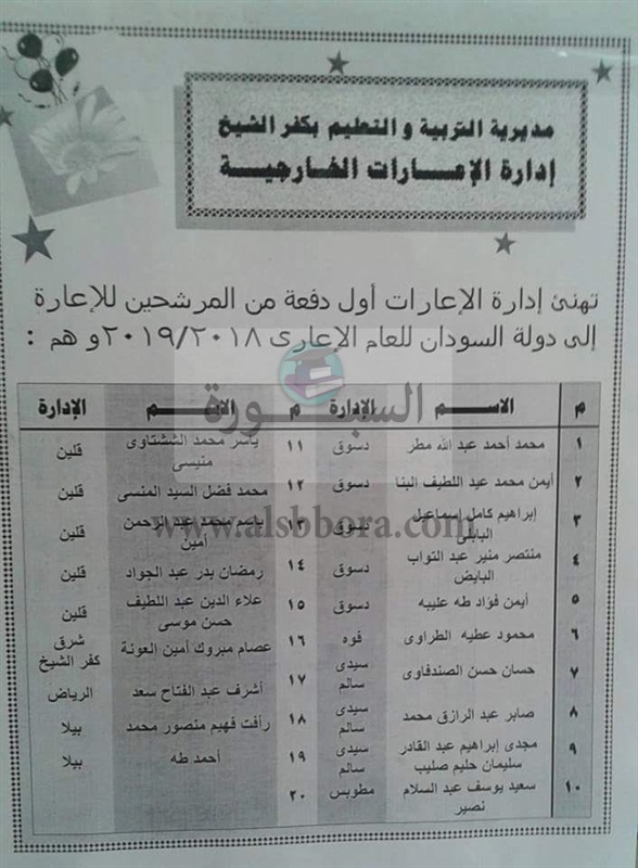 أعلنت مديرية التربية والتعليم بكفر الشيخ ، عن ترشيح 19 معلماً ومعلمه للإعارة لدولة السودان ،في تخصصات ، الرياضيات ، اللغة الانجليزيه ، علوم ، دراسات للتعليم الابتدائي ، عربي ، فرنساوي ، فلسفة ، تربيه رياضيه ، موجه مالي وإداري .